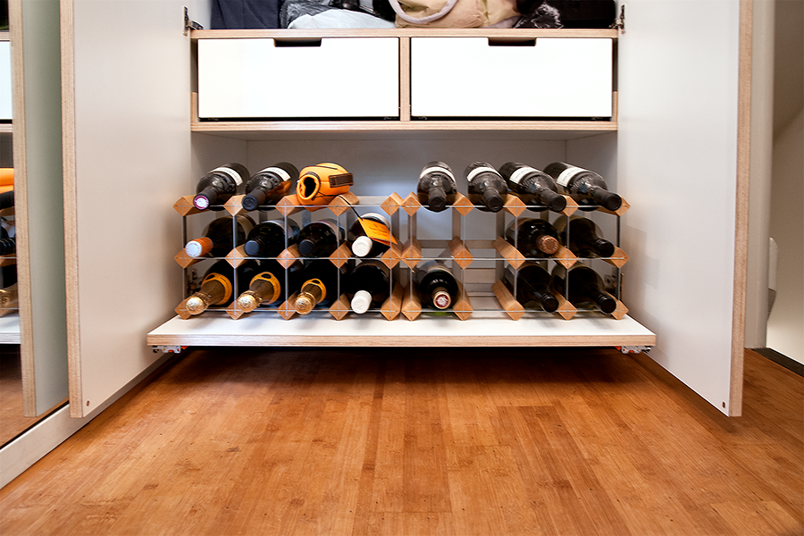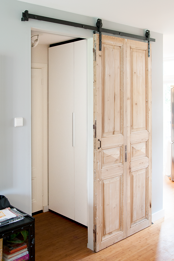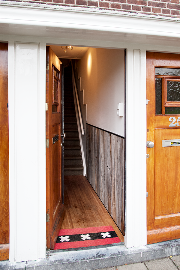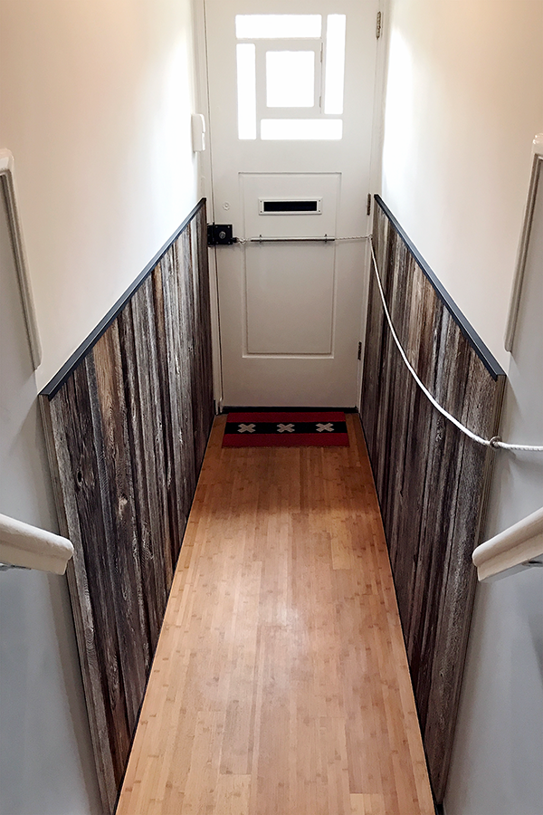 Kledingkast en opbergkast in entree ruimte en een uit oude planken opgebouwde lambrisering in het trappenhuis.